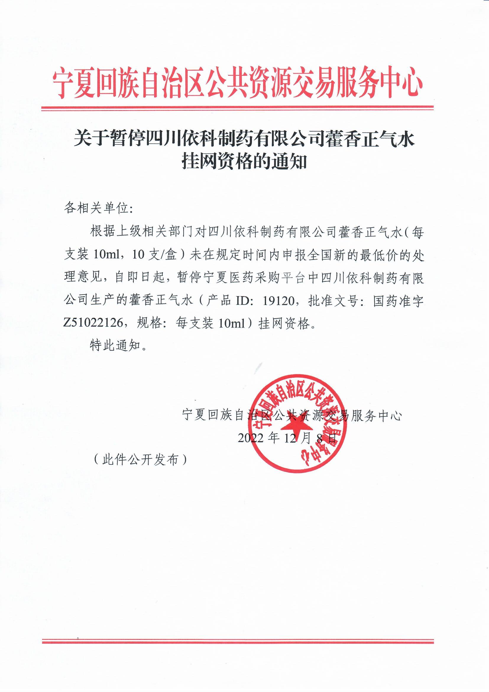 【宁夏】宁夏回族自治区关于暂停四川依科制药有限公司藿香正气水挂网资格的通知
