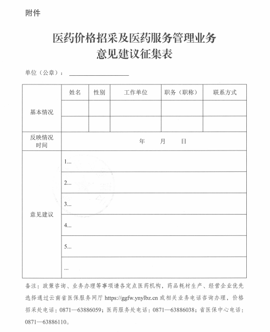 (一)收集信息。各定点医药机构,药品耗材生产、经营企业于每月1—25日将《医药价格招采及医药服务管理业务意见建议征集表》(详见附件)发送至指定邮箱:ynsylbzj@163.com,便于省医保局梳理相关情况,确定会商内容和具体安排。请确保填报信息真实准确,同一事项、相同问题不重复受理。