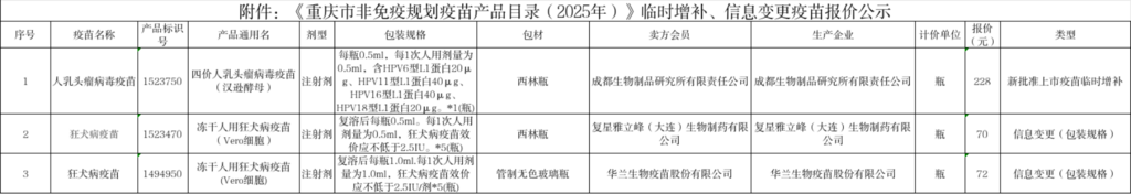 根据《重庆市非免疫规划疫苗集中采购实施方案》(渝疾控发〔2026〕1号),《重庆市非免疫规划疫苗产品目录(2025年)》临时增补、信息变更疫苗报价结果已完成初审,现予以公示。