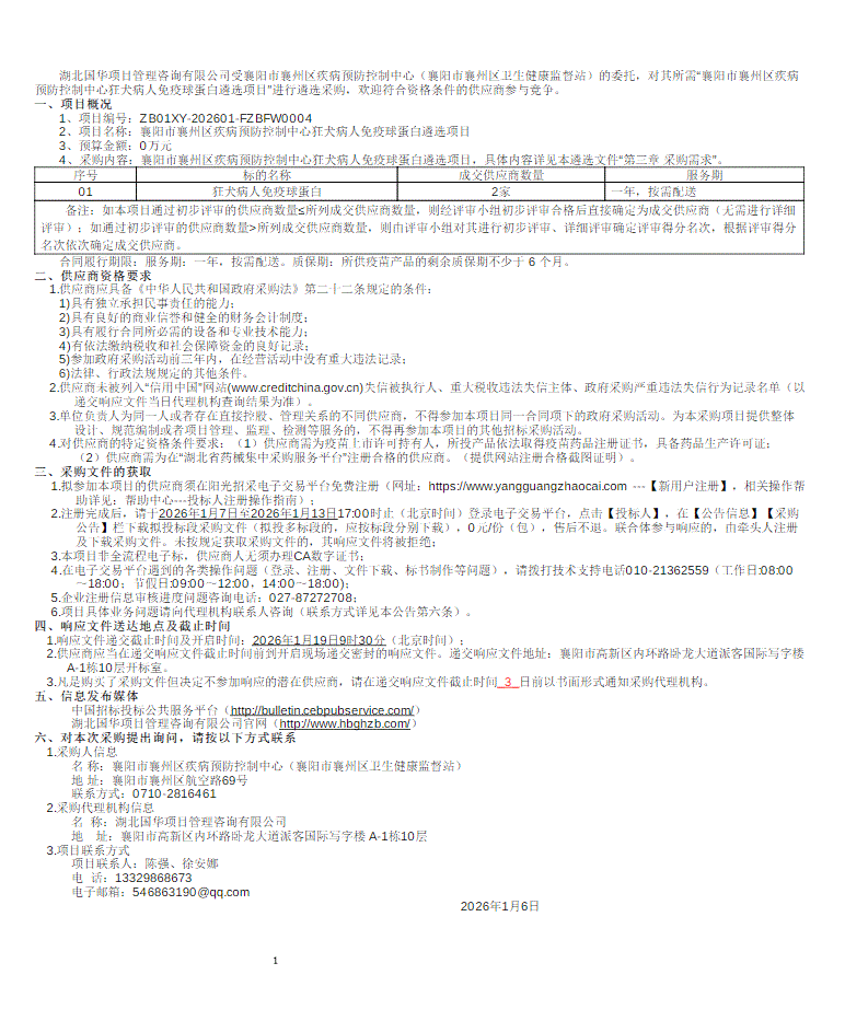 【襄阳市襄州区疾病预防控制中心】湖北省襄阳市襄州区疾病预防控制中心狂犬病人免疫球蛋白遴选采购公告