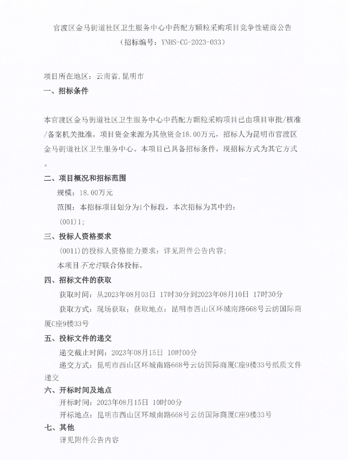 【昆明市官渡区金马街道社区卫生服务中心】云南省昆明市官渡区金马街道社区卫生服务中心中药配方颗粒采购项目竞争性磋商公告