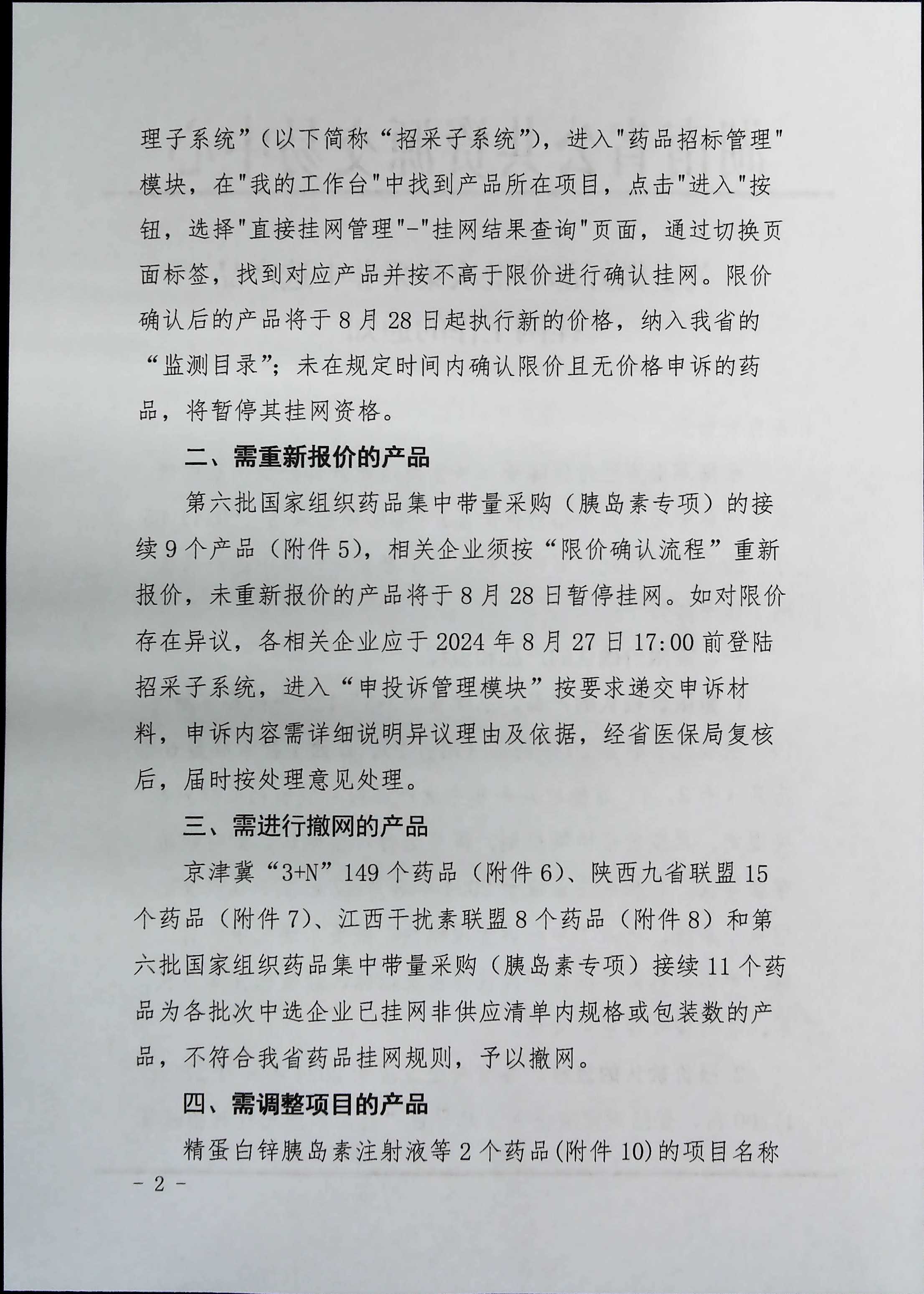 第六批国家组织药品集中带量采购(胰岛素专项)的接续9个产品(附件5),相关企业须按“限价确认流程”重新报价,未重新报价的产品将于8月28日暂停挂网。如对限价存在异议,各相关企业应于2024年8月27日17:00前登陆招采子系统,进入“申投诉管理模块”按要求递交申诉材料,申诉内容需详细说明异议理由及依据,经省医保局复核后,届时按处理意见处理。