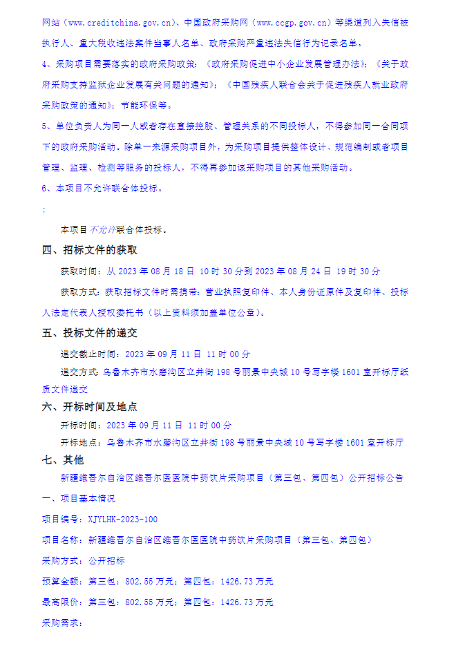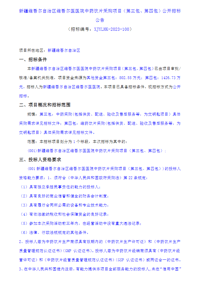 【新疆维吾尔自治区维吾尔医医院】新疆维吾尔自治区维吾尔医医院中药饮片采购项目(第三包、第四包)公开招标公告