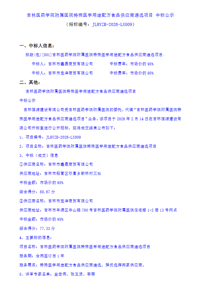 【吉林医药学院附属医院】吉林省吉林医药学院附属医院特殊医学用途配方食品供应商遴选项目中标公示