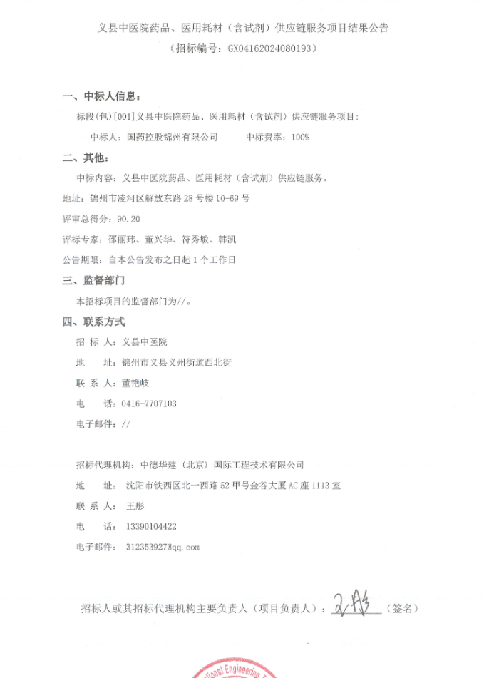【锦州市义县中医院】辽宁省锦州市义县中医院药品、医用耗材(含试剂)供应链服务项目结果公告