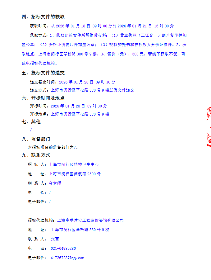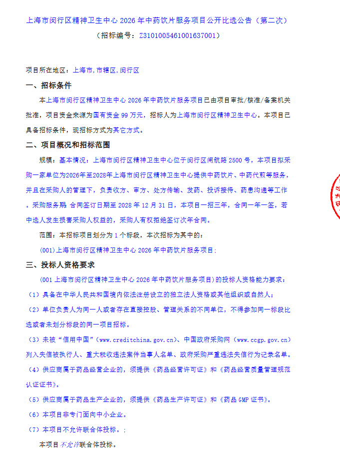 【上海市闵行区精神卫生中心】上海市闵行区精神卫生中心2026年中药饮片服务项目公开比选公告(第二次)