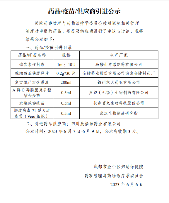 【成都市金牛区妇幼保健院】四川省成都市金牛区妇幼保健院药品/疫苗/供应商引进公示