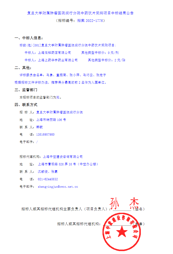 【上海市复旦大学附属肿瘤医院】闵行分院中药饮片采购项目中标结果公告