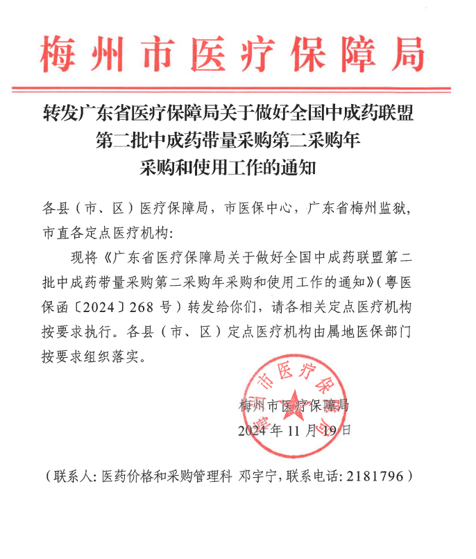 【梅州】广东省梅州市转发广东省医疗保障局关于做好全国中成药联盟第二批中成药带量采购第二采购年采购和使用工作的通知