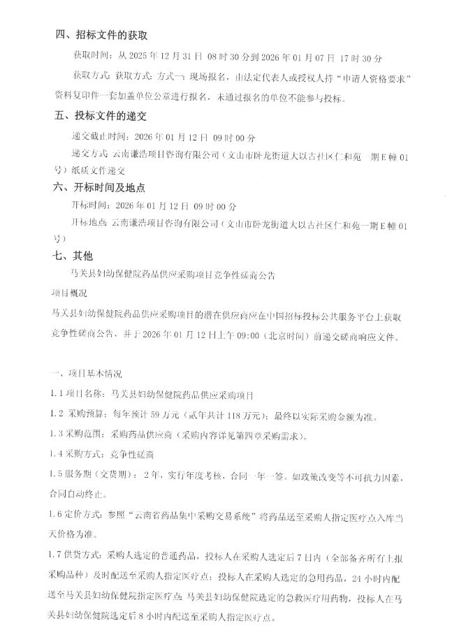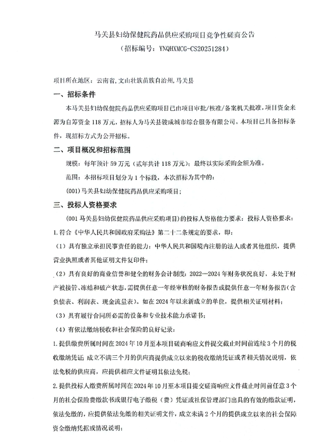 【文山壮族苗族自治州马关县妇幼保健院】云南省文山壮族苗族自治州马关县妇幼保健院药品供应采购项目竞争性磋商公告