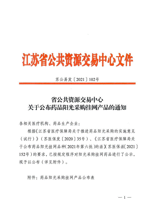【江苏】2021年江苏省公共资源交易中心关于公布药品阳光采购挂网产品的通知 苏公易发[2021]102号