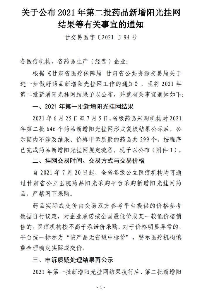 【甘肃】甘肃省关于公布2021年第二批药品新增阳光挂网结果等有关事宜的通知