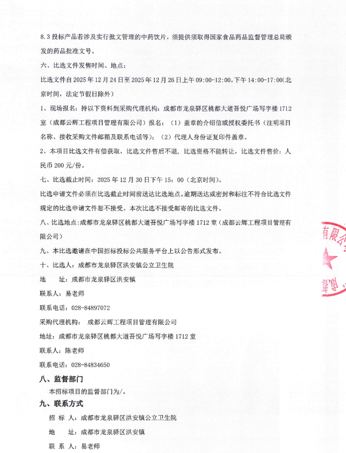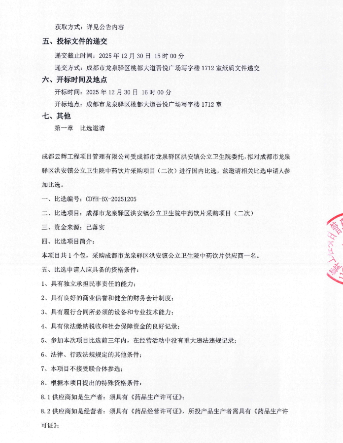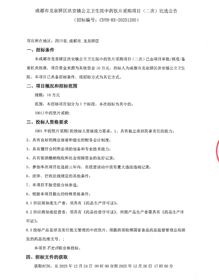 【成都市龙泉驿区洪安镇公立卫生院】四川省成都市龙泉驿区洪安镇公立卫生院中药饮片采购项目(二次)比选公告