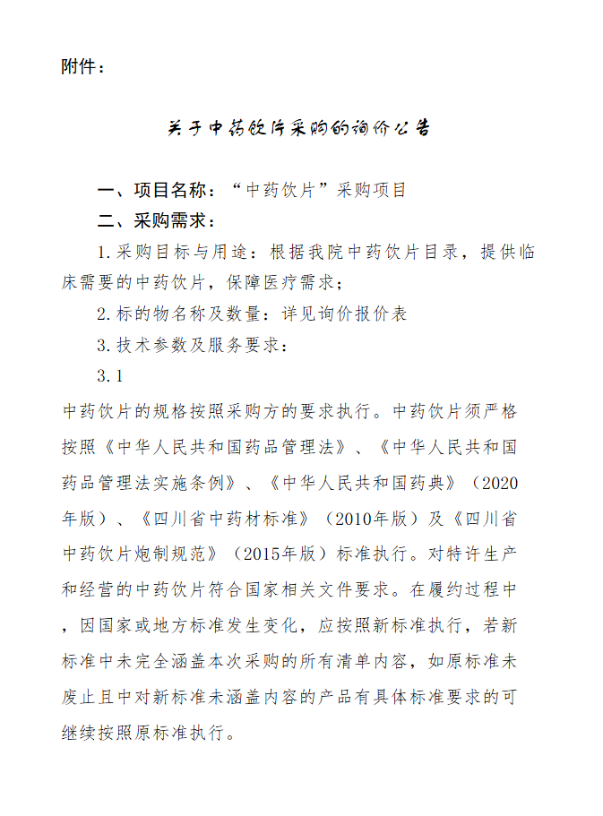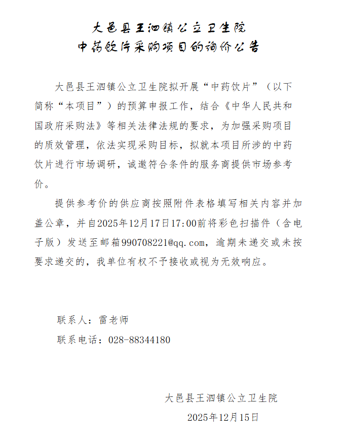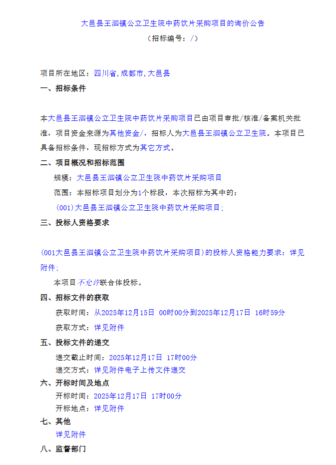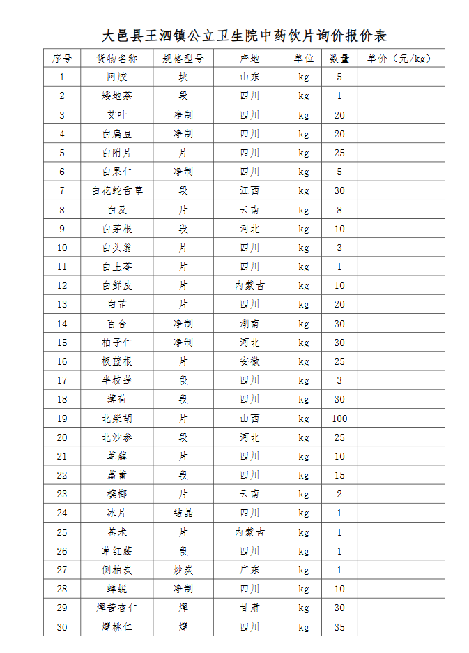 【成都市大邑县王泗镇公立卫生院】四川省大邑县王泗镇公立卫生院中药饮片采购项目的询价公告
