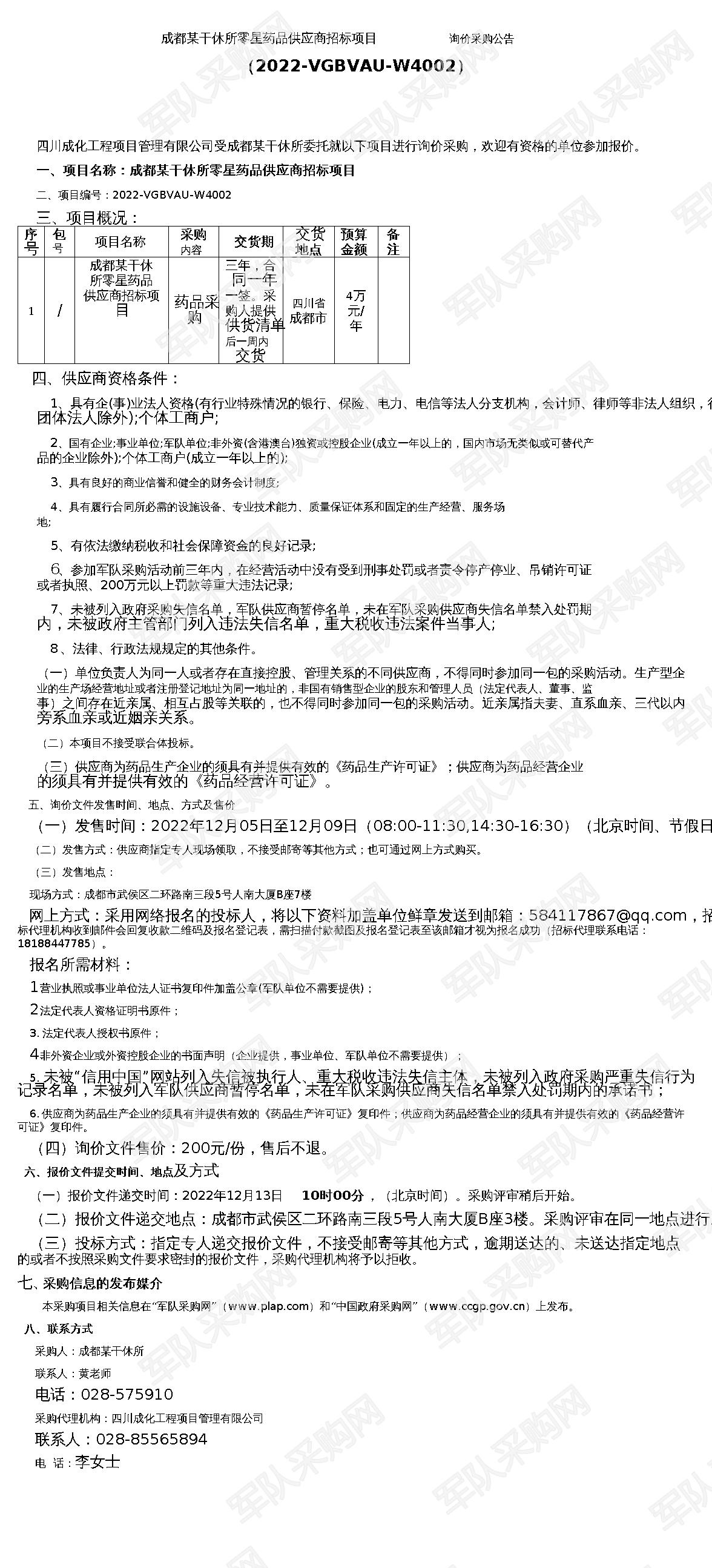 【成都某干休所】军队采购网成都某干休所零星药品供应商招标项目询价采购公告(2022-VGBVAU-W4002)