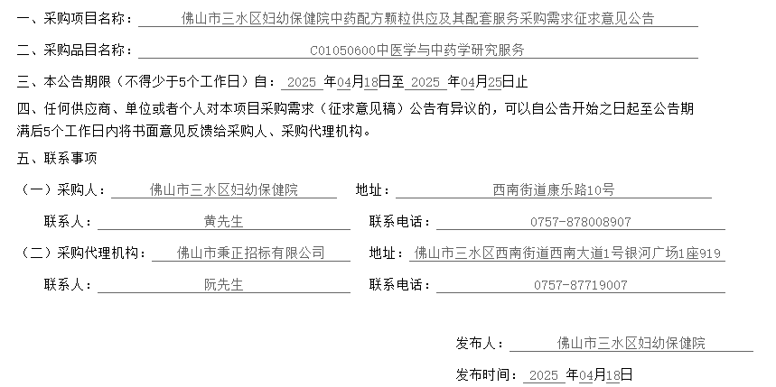 【佛山市三水区妇幼保健院】广东省佛山市三水区妇幼保健院中药配方颗粒供应及其配套服务采购需求征求意见公告(20250418)