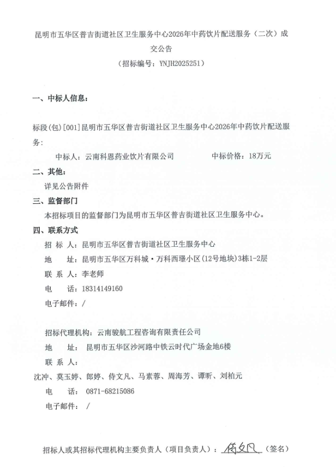 【昆明市五华区普吉街道社区卫生服务中心】云南省昆明市五华区普吉街道社区卫生服务中心2026年中药饮片配送服务(二次)成交公告