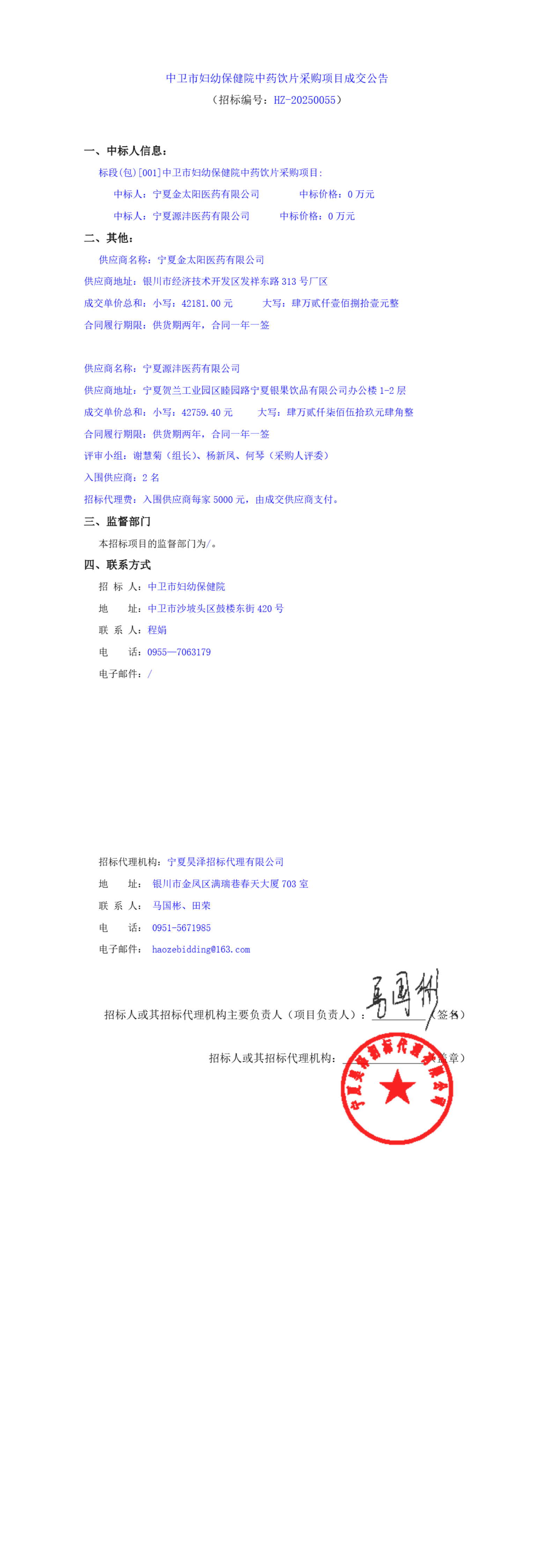 【中卫市妇幼保健院】宁夏回族自治区中卫市妇幼保健院中药饮片采购项目成交公告(20260105)