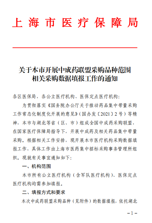 【上海】关于本市开展中成药联盟采购品种范围相关采购数据填报工作的通知