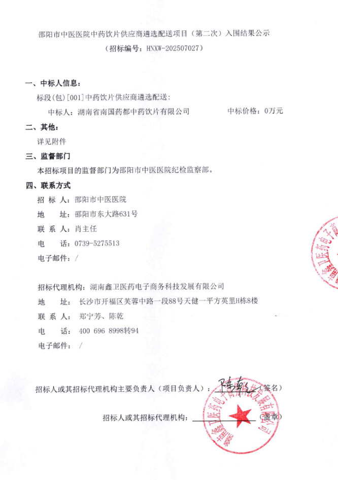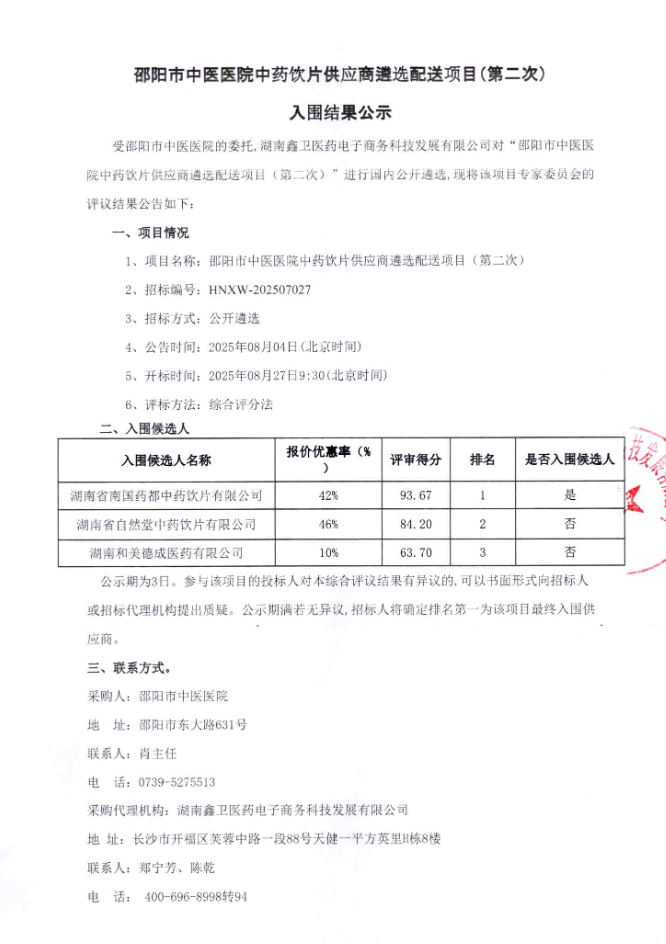 【邵阳市中医医院】湖南省邵阳市中医医院中药饮片供应商遴选配送项目(第二次)入围结果公示