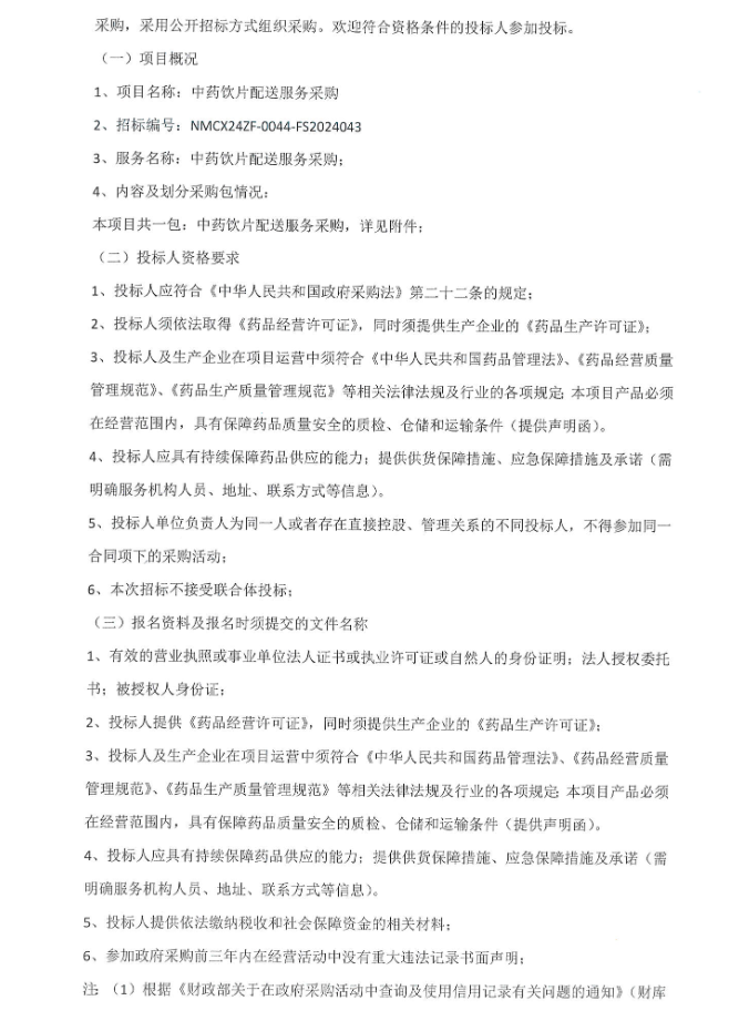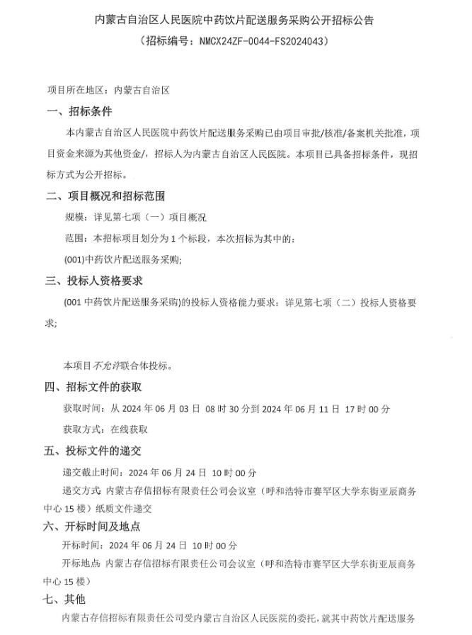 【内蒙古自治区人民医院】内蒙古自治区人民医院中药饮片配送服务采购公开招标公告