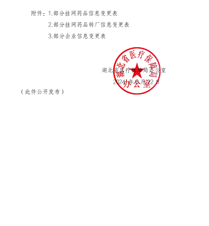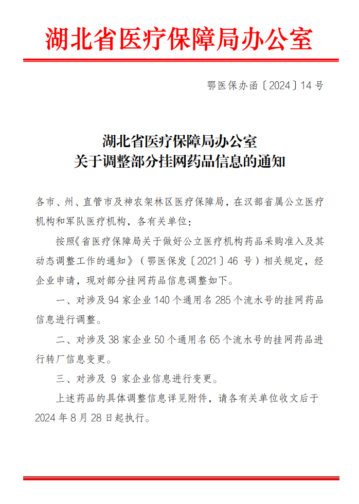 【鄂州】鄂医保办函〔2024〕14 号湖北省医疗保障局办公室关于调整部分挂网药品信息的通知