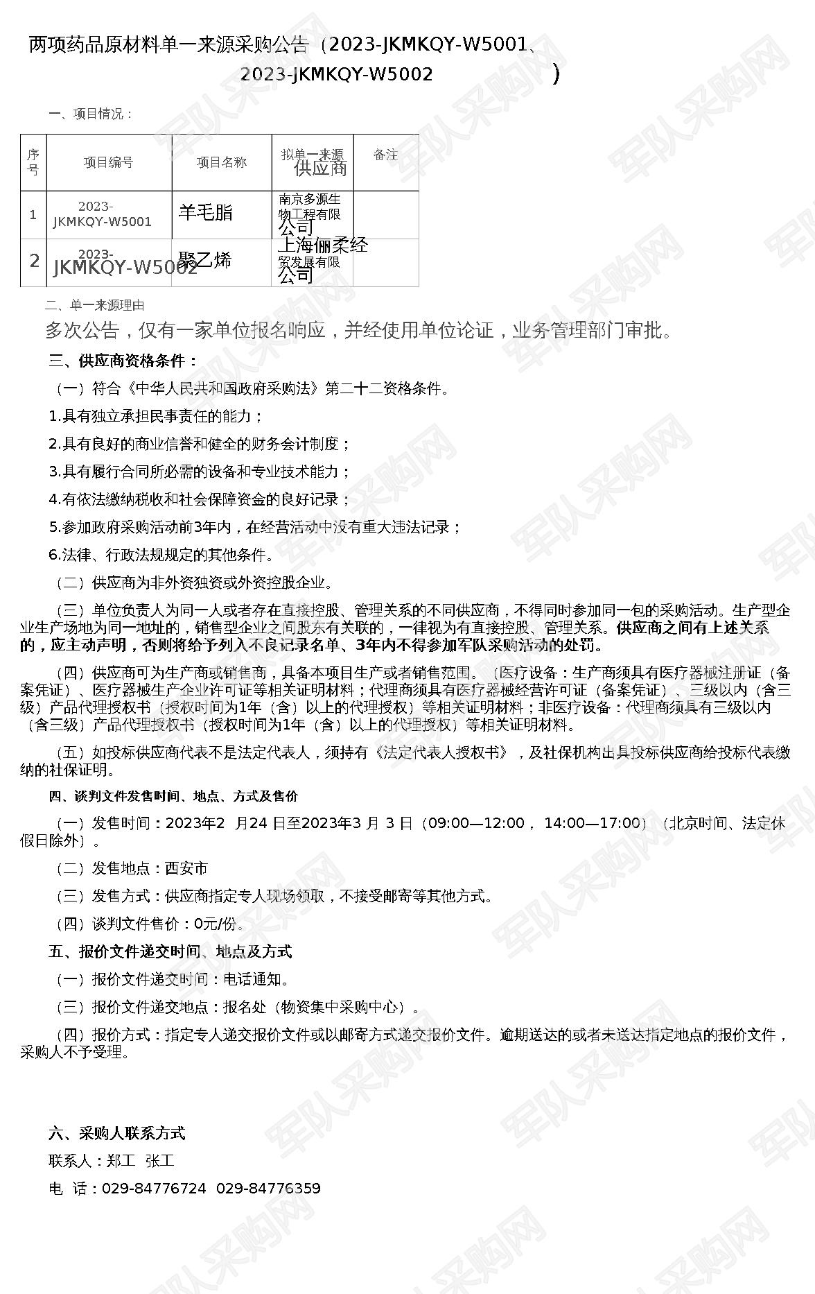 【军队采购】军队采购网两项药品原材料单一来源采购公告(2023-JKMKQY-W5001、2023-JKMKQY-W5002)