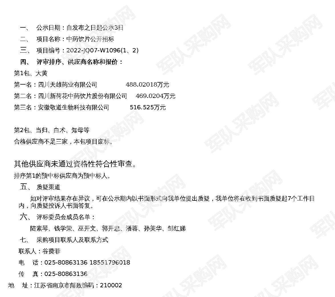 【军队采购】中药饮片公开招标结果公示(2022-JQ07-W1096(1、2))