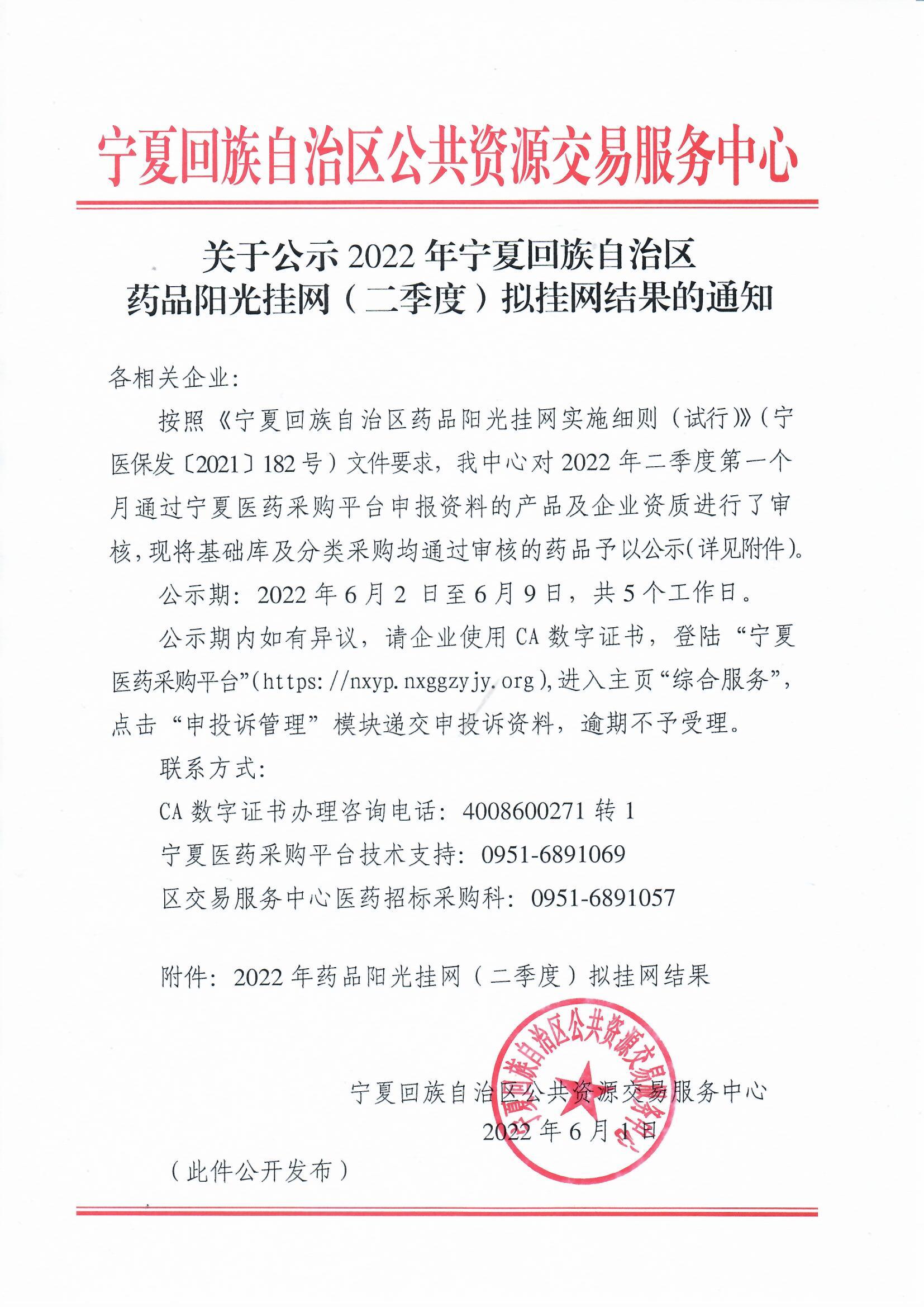 【宁夏】关于公示2022年宁夏回族自治区药品阳光挂网(二季度)拟挂网结果的通知