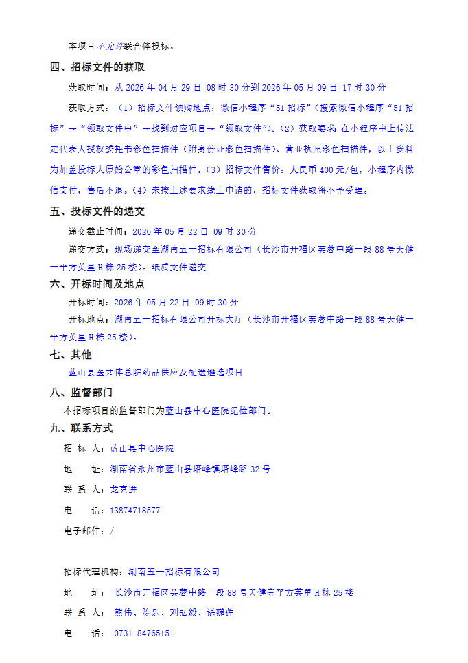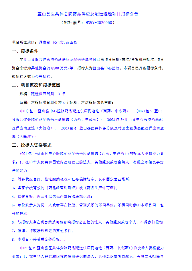 【永州市蓝山县中心医院】湖南省永州市蓝山县医共体总院药品供应及配送遴选项目招标公告