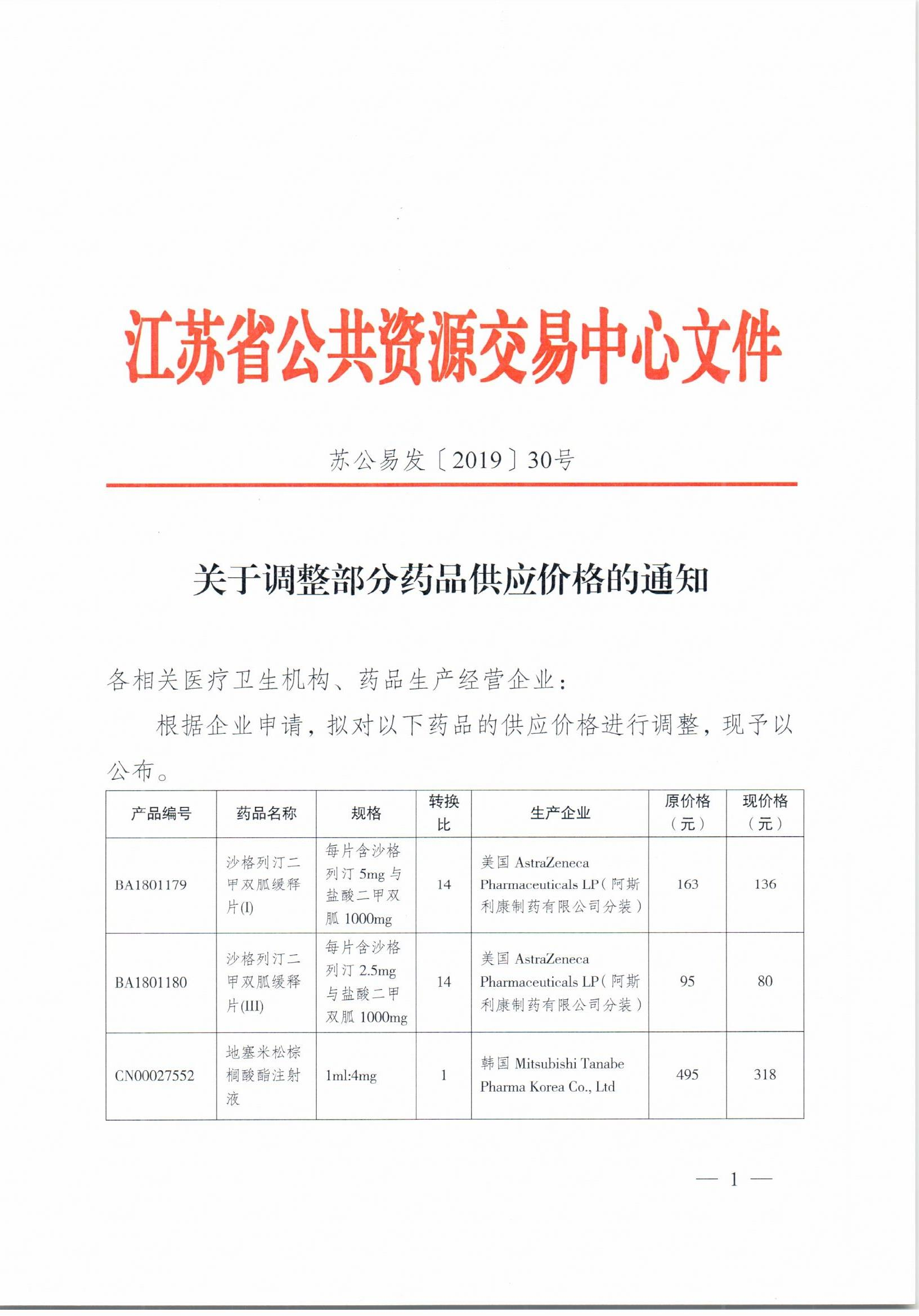 【江苏】江苏省关于调整部分药品供应价格的通知(20190412)