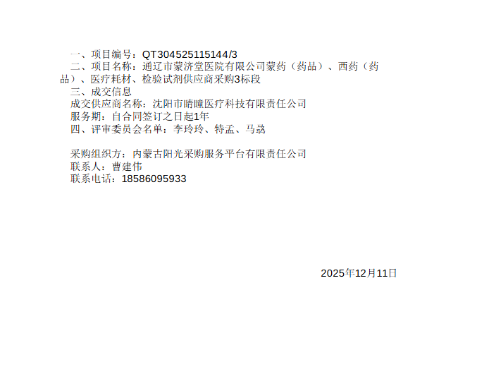 【通辽市蒙济堂医院有限公司】内蒙古自治区通辽市蒙济堂医院有限公司蒙药(药品)、西药(药品)、医疗耗材、检验试剂供应商采购结果公告3