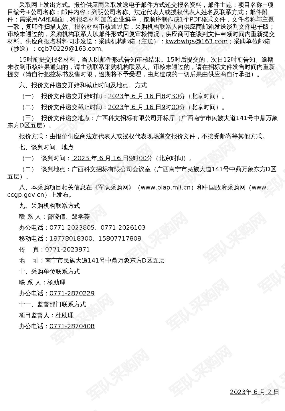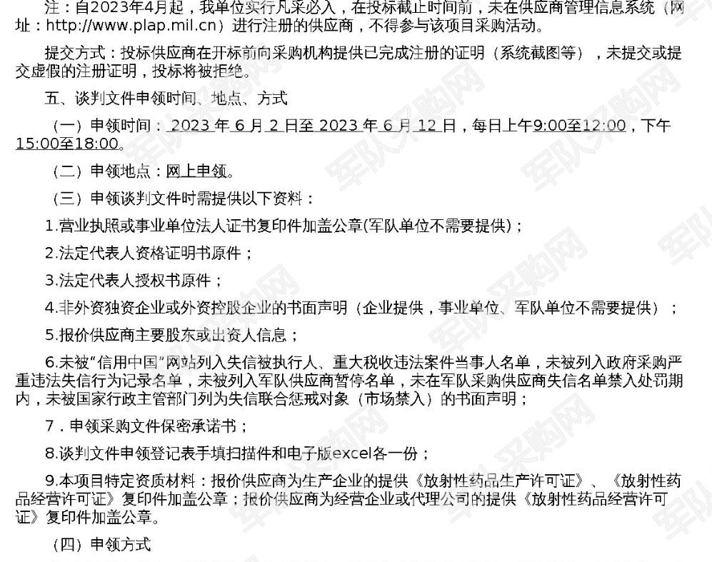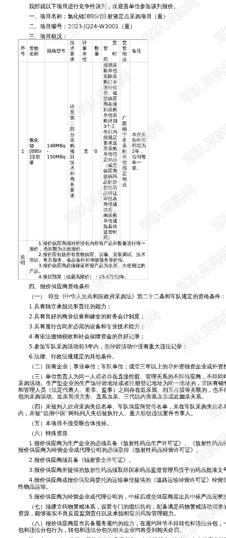 【南宁市某医院】军队采购网南宁市某医院氯化锶〔89Sr〕注射液定点采购项目(重)竞争性谈判公告(项目编号:2023-JQ24-W3001(重))