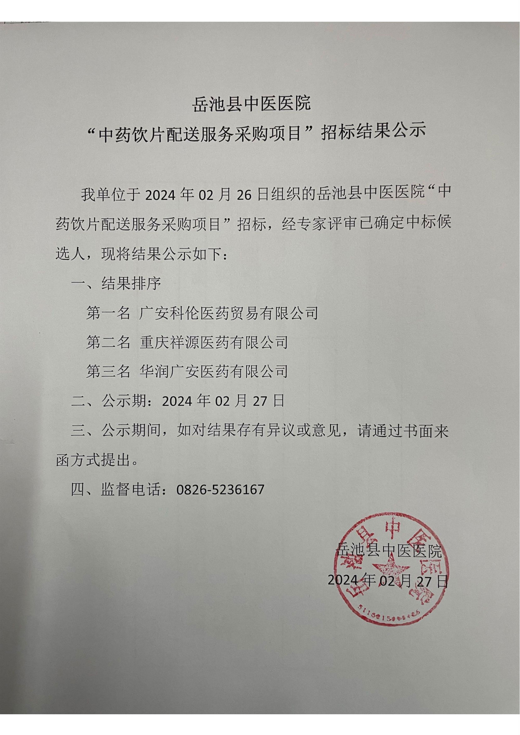 【广安市岳池县中医医院】四川省广安市岳池县中医医院“中药饮片配送服务采购项目”招标结果公示(20240227)