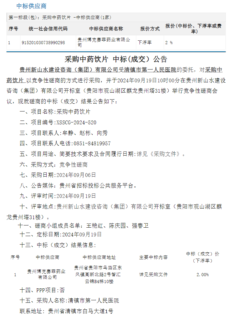 【贵阳市清镇市第一人民医院】贵州省贵阳市清镇市第一人民医院采购中药饮片中标(成交)结果公告