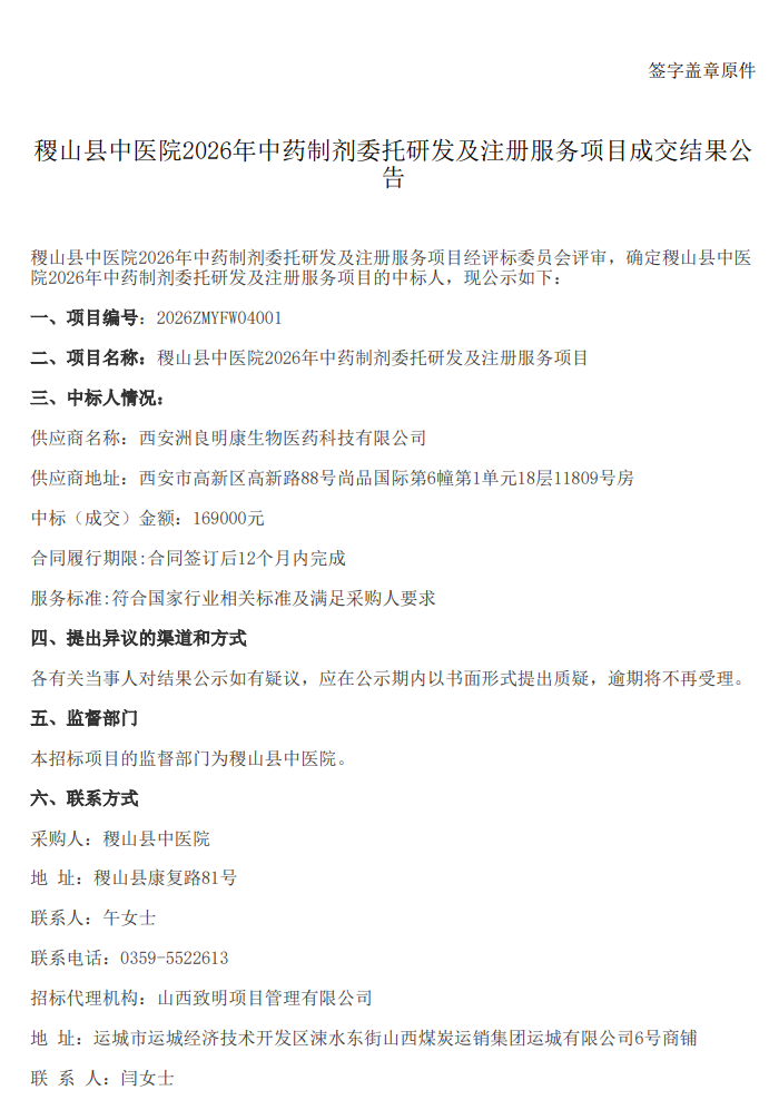 【运城市稷山县中医院】山西省运城市稷山县中医院2026年中药制剂委托研发及注册服务项目成交结果公告