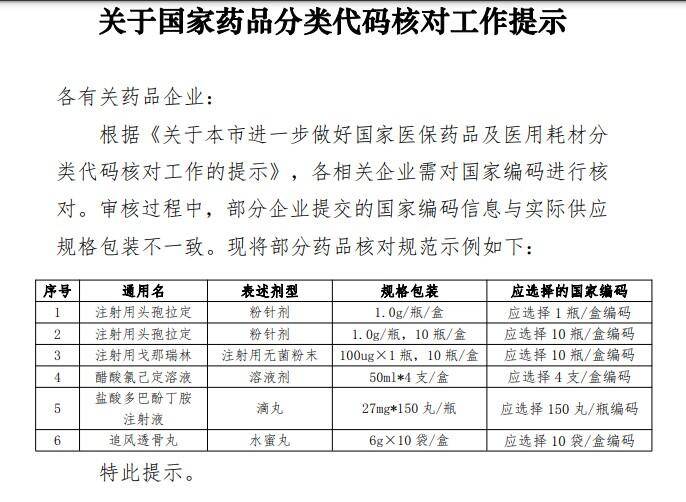 根据《关于本市进一步做好国家医保药品及医用耗材分类代码核对工作的提示》,各相关企业需对国家编码进行核对。审核过程中,部分企业提交的国家编码信息与实际供应规格包装不一致。现将部分药品核对规范示例如下: