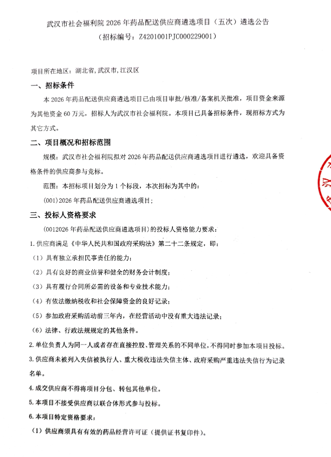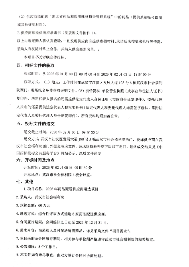 【武汉市社会福利院】湖北省武汉市社会福利院2026年药品配送供应商遴选项目(五次)遴选公告