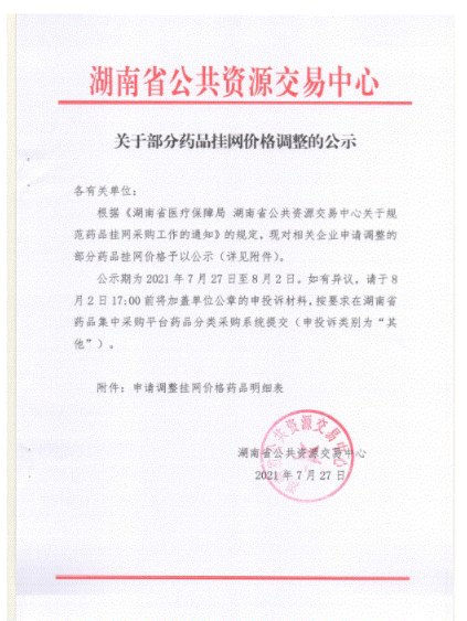 【湖南】2021年湖南省关于部分药品挂网价格调整的公示