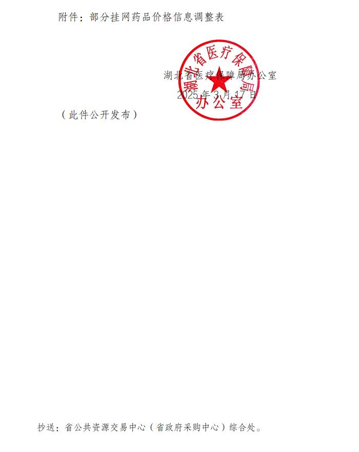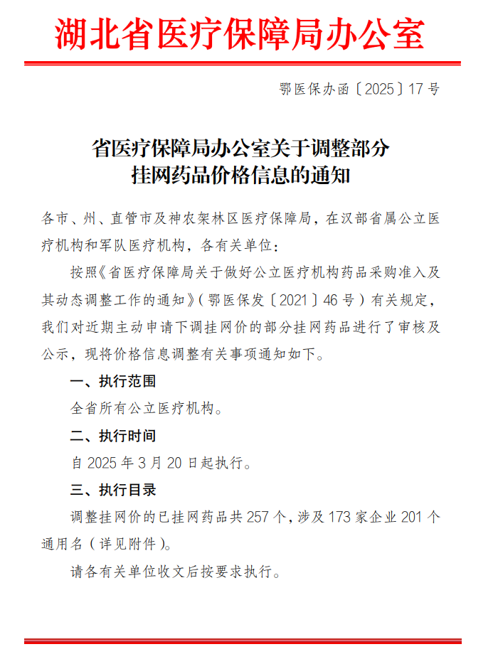 【鄂州】鄂医保办函〔2025〕17号省医疗保障局办公室关于调整部分挂网药品价格信息的通知