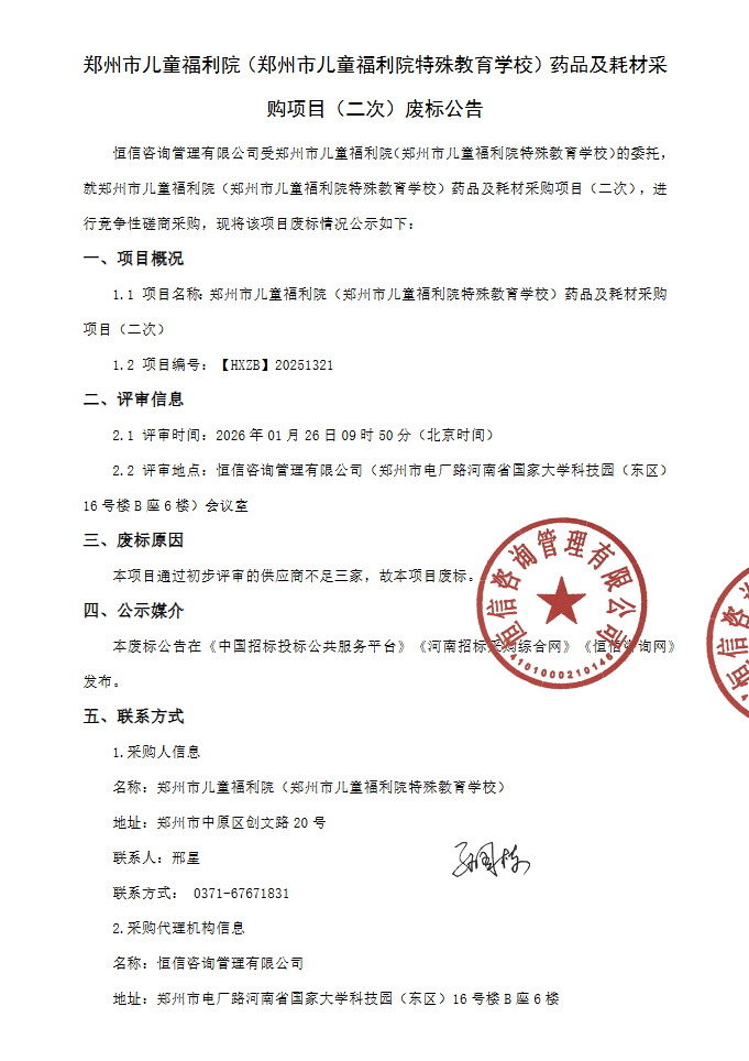 【郑州市儿童福利院】河南省郑州市儿童福利院(郑州市儿童福利院特殊教育学校)药品及耗材采购项目(二次)废标公告