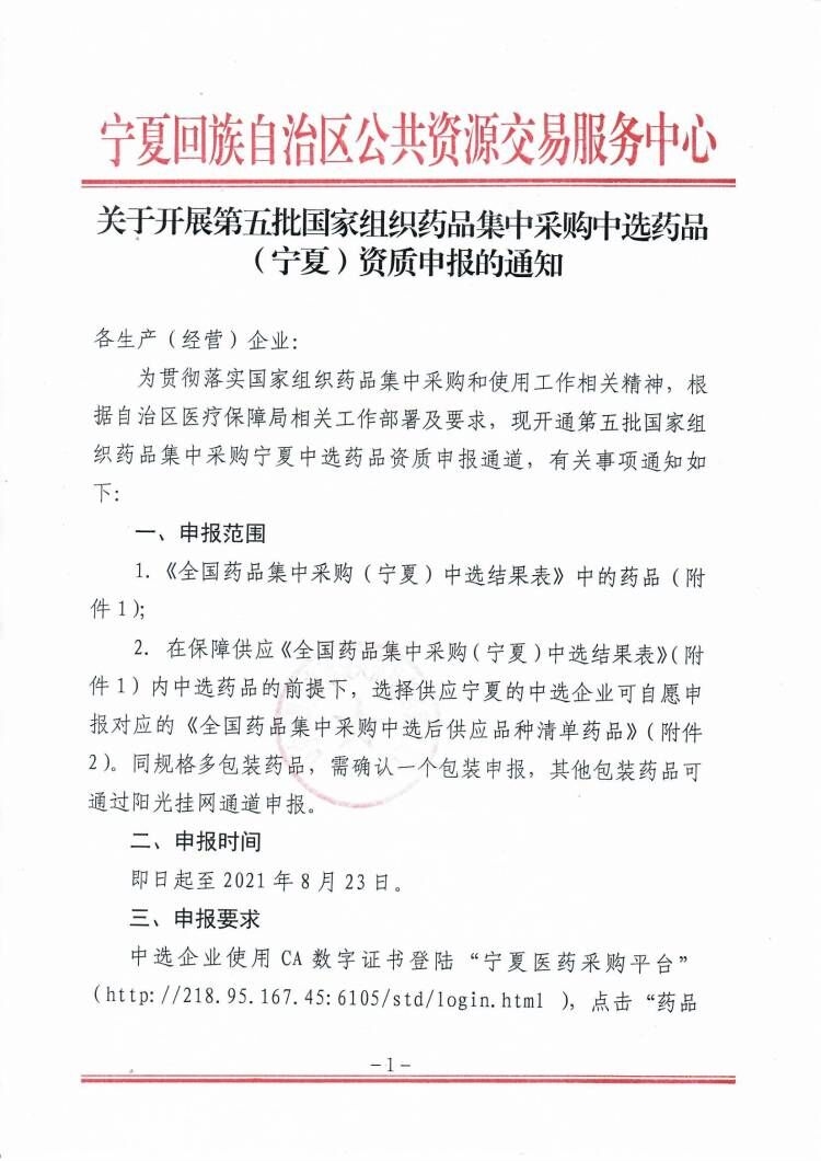 【宁夏】2021年宁夏自治区关于开展第五批国家组织药品集中采购中选药品(宁夏)资质申报的通知