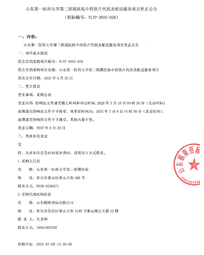 【山东第一医科大学第二附属医院】中药饮片代煎及配送服务项目更正公告