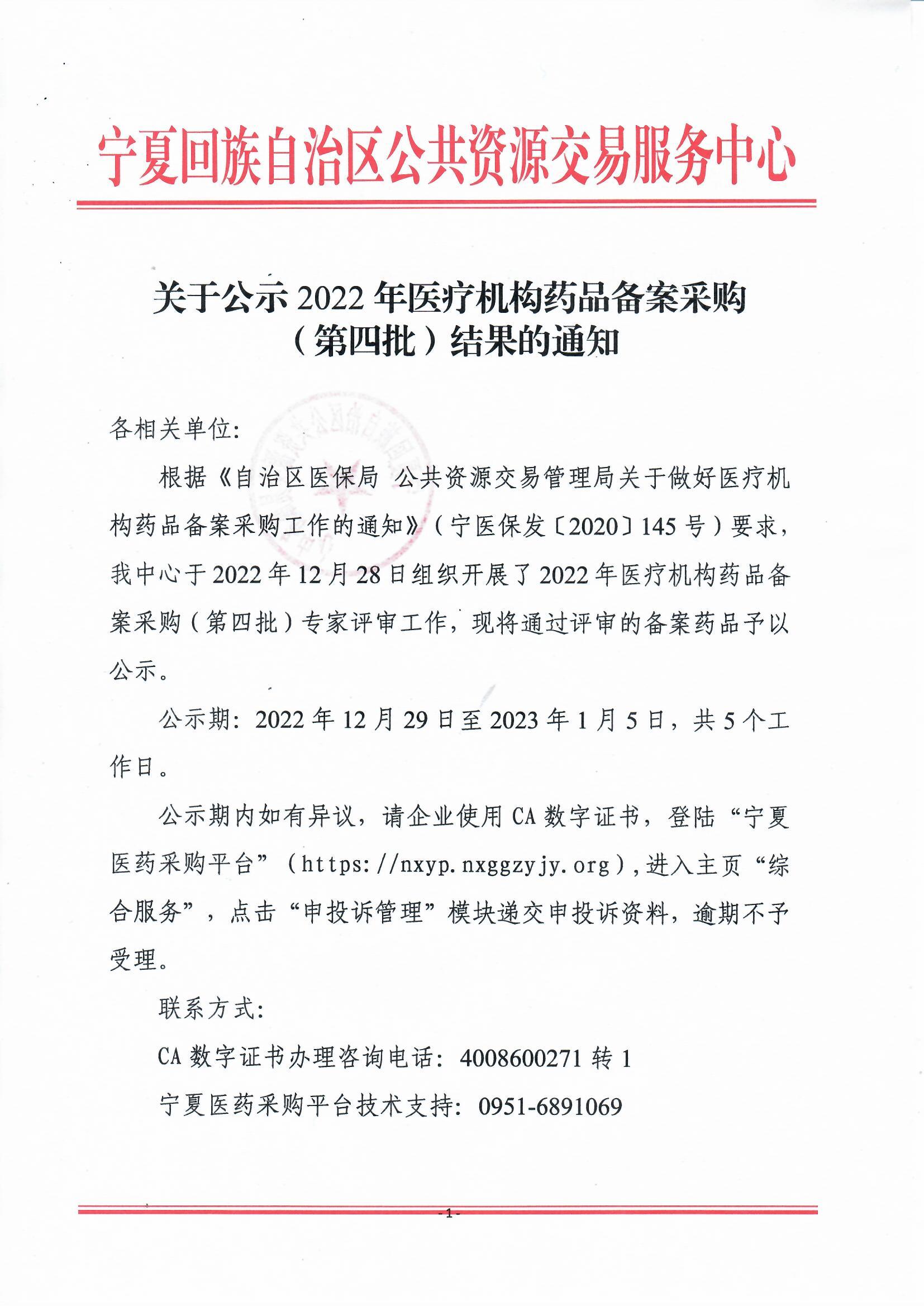 根据《自治区医保局 公共资源交易管理局关于做好医疗机构药品备案采购工作的通知》(宁医保发〔2020〕145号)要求,我中心于2022年12月28日组织开展了2022年医疗机构药品备案采购(第四批)专家评审工作,现将通过评审的备案药品予以公示。