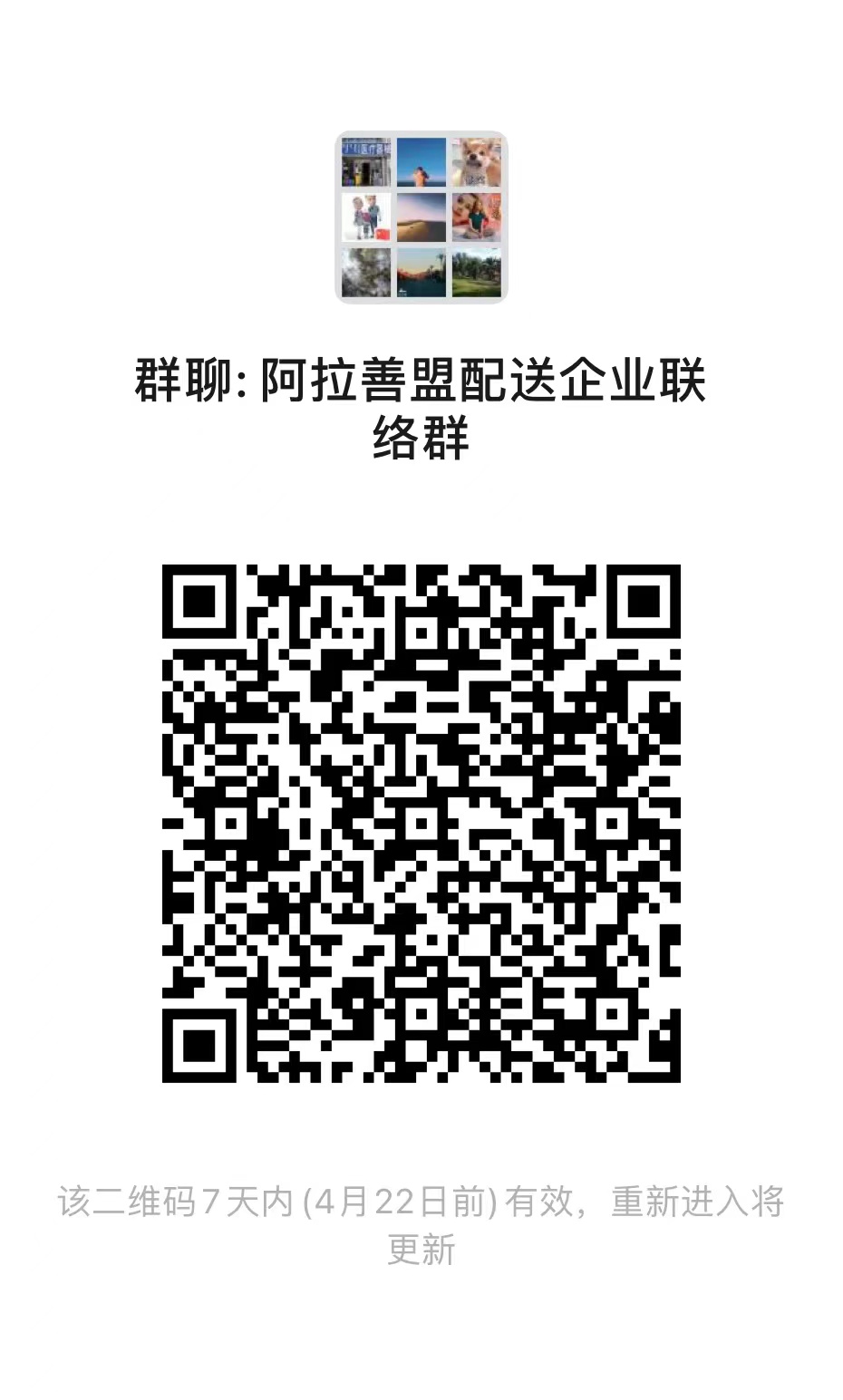 三、通过名单中已注册认证通过的药品、医用耗材配送企业,我中心会及时开通配送区域,待开通配送区域后,配送企业可联系生产企业在系统内建立配送关系。各配送企业通过扫描下方二维码加入“阿拉善盟配送企业联络群”(申请时需备注企业全称)。