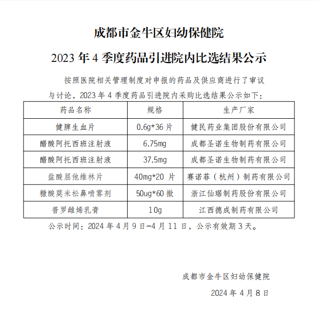 【成都市金牛区妇幼保健院】四川省成都市金牛区妇幼保健院2023年4季度药品引进院内比选结果公示