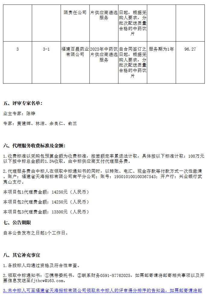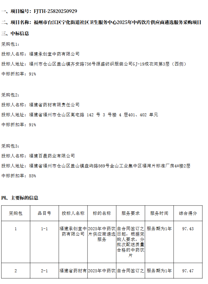 【福州市台江区宁化街道社区卫生服务中心】福建省福州市台江区宁化街道社区卫生服务中心2025年中药饮片供应商遴选服务采购项目中标公告
