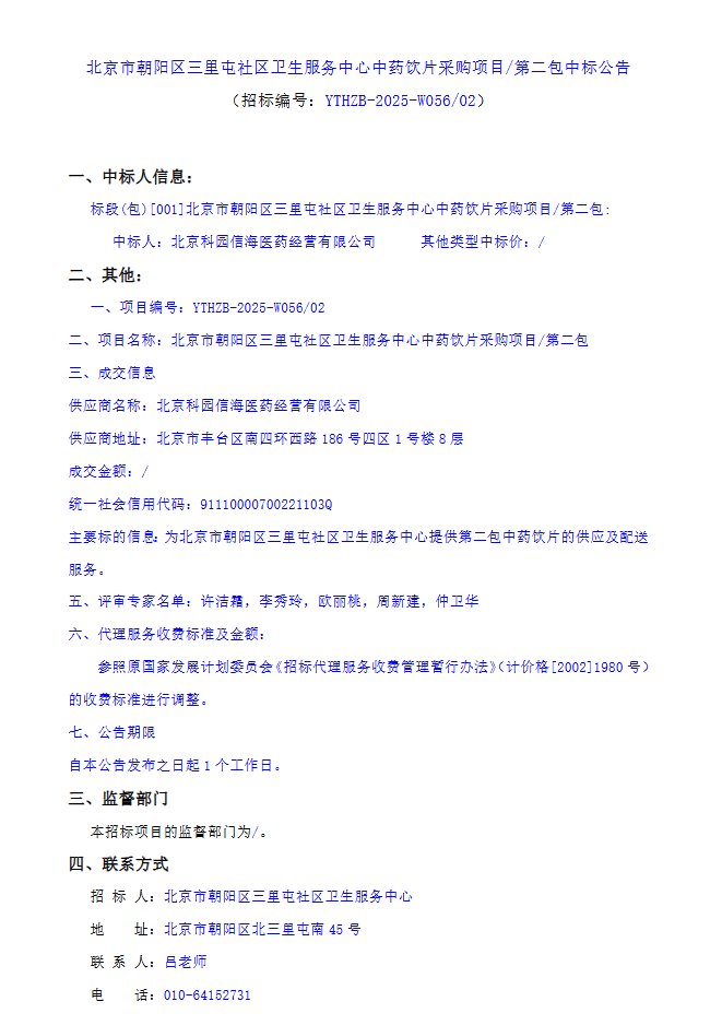 【北京市朝阳区三里屯社区卫生服务中心】北京市朝阳区三里屯社区卫生服务中心中药饮片采购项目/第二包中标公告