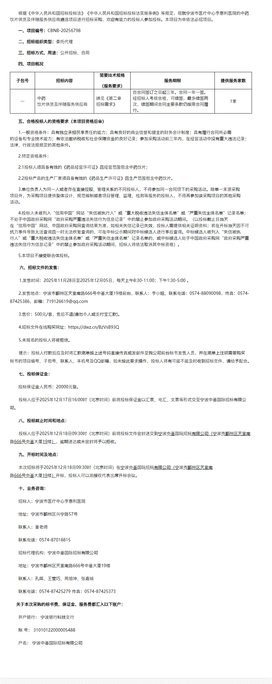 【宁波市医疗中心李惠利医院】浙江省宁波市医疗中心李惠利医院中药饮片供货及伴随服务供应商遴选项目招标公告