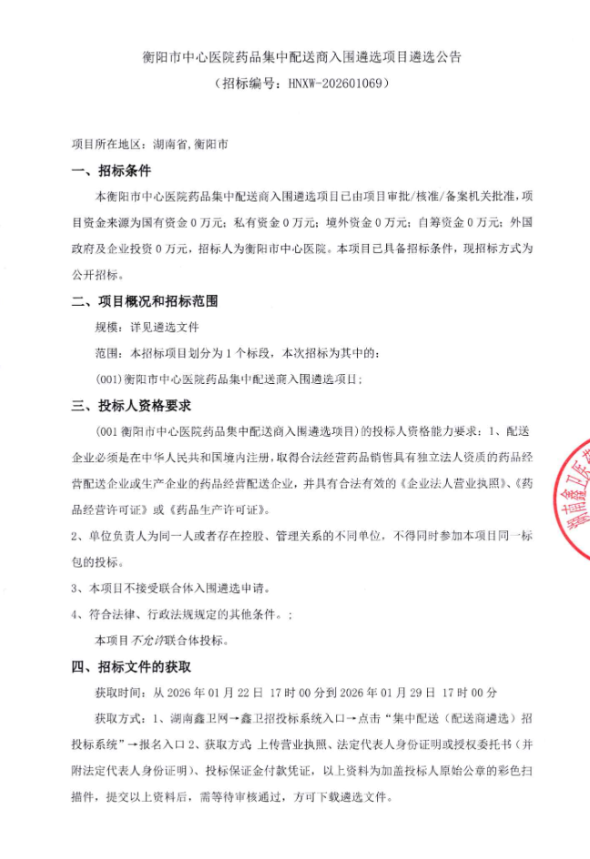 【衡阳市中心医院】湖南省衡阳市中心医院药品集中配送商入围遴选项目遴选公告